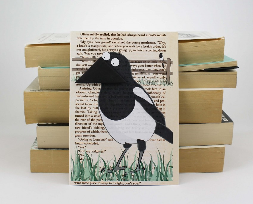 Magnificent magpies set against a backdrop of a printed book page. Finished with a hand made origami beak which transforms into a bookmark. Ideal for bird loving book lovers.