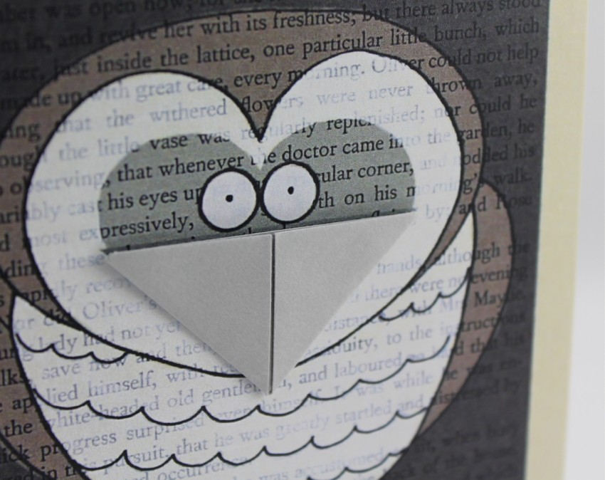 Enigmatic owl set against a backdrop of a printed book page. Finished with a hand made origami beak which transforms into a bookmark. Ideal for bird loving book lovers.