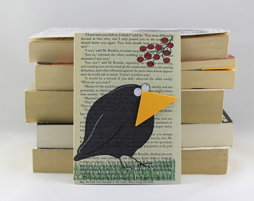 Bemused blackbird set against a backdrop of a printed book page. Finished with a hand made origami beak which transforms into a bookmark. Ideal for bird loving book lovers.