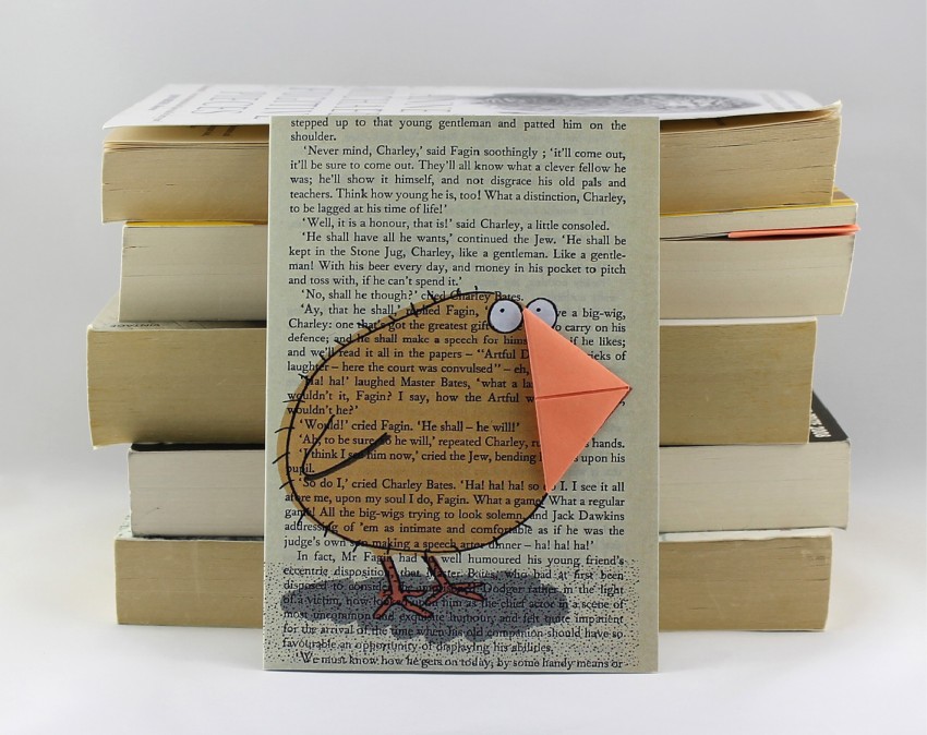 Cheeky chick set against a backdrop of a printed book page. Finished with a hand made origami beak which transforms into a bookmark. Ideal for bird loving book lovers.