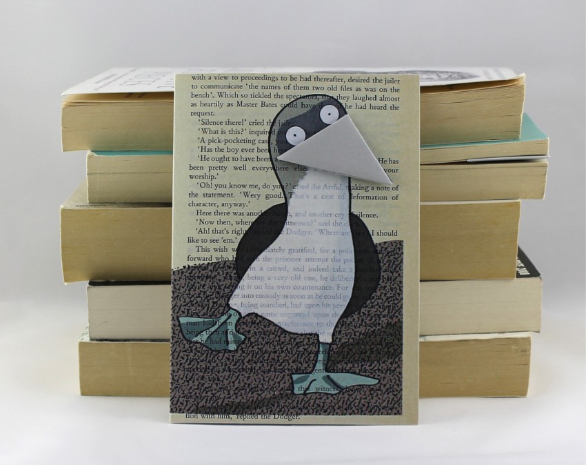 Boogieing blue footed booby set against a backdrop of a printed book page. Finished with a hand made origami beak which transforms into a bookmark. Ideal for bird loving book lovers.