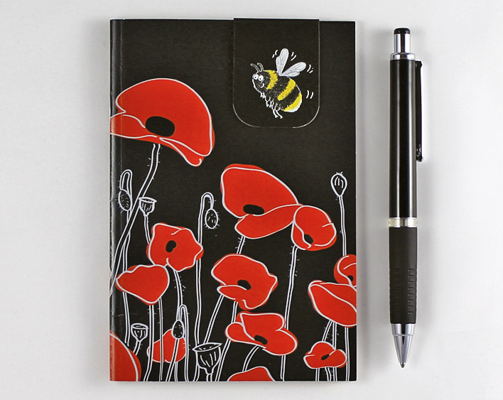 A6 notebook featuring a wraparound poppy meadow illustration and a magnetic bee bookmark gift.