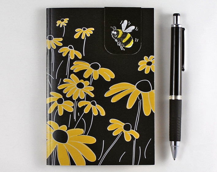 A6 notebook featuring a wraparound rudbeckia meadow illustration and a magnetic bee bookmark gift.