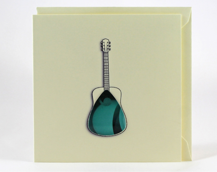 Acoustic guitar image with removable plectrum gift made using upcycled plastic. Colour and design of plectrum will vary according to plastic store cards available.