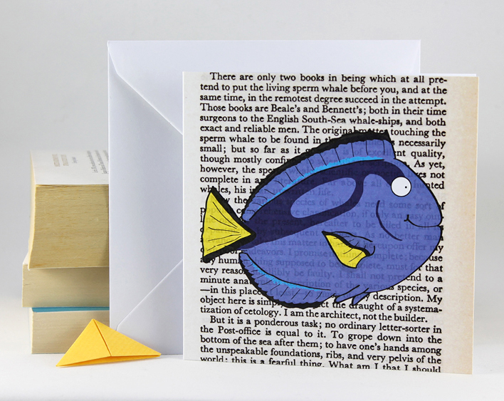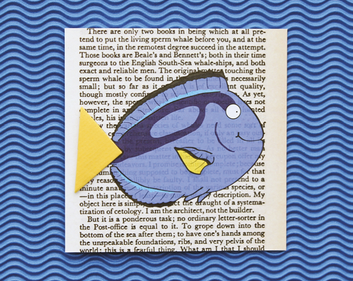 Blue Tang set against a backdrop of a printed book page. Finished with a handmade origami tail which transforms into a bookmark.
