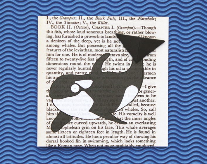 Orca set against a backdrop of a printed book page. Finished with a handmade origami tail which transforms into a bookmark.