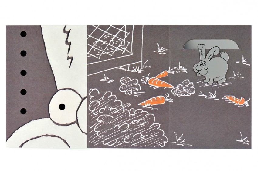 Once removed from the silver coloured envelope the zig zag fold card opens out to reveal the hand finished stainless steel rabbit bookmark nestled in a scene inside.