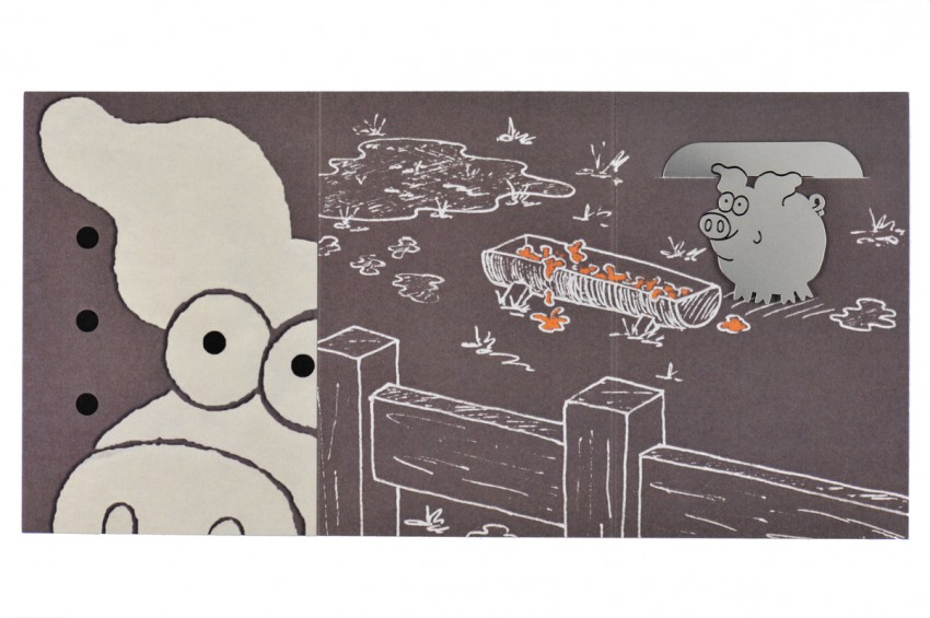 Once removed from the silver coloured envelope the zig zag fold card opens out to reveal the hand finished stainless steel pig bookmark nestled in a scene inside.