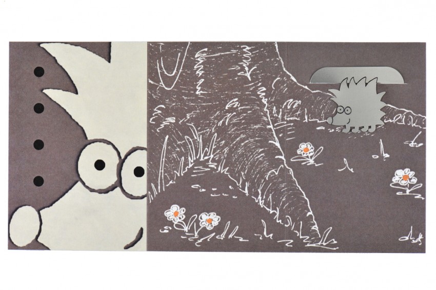 Once removed from the silver coloured envelope the zig zag fold card opens out to reveal the hand finished stainless steel hedgehog bookmark nestled in a scene inside. There’s space to write your greeting on the front or, for longer messages, there’s white space on the reverse.