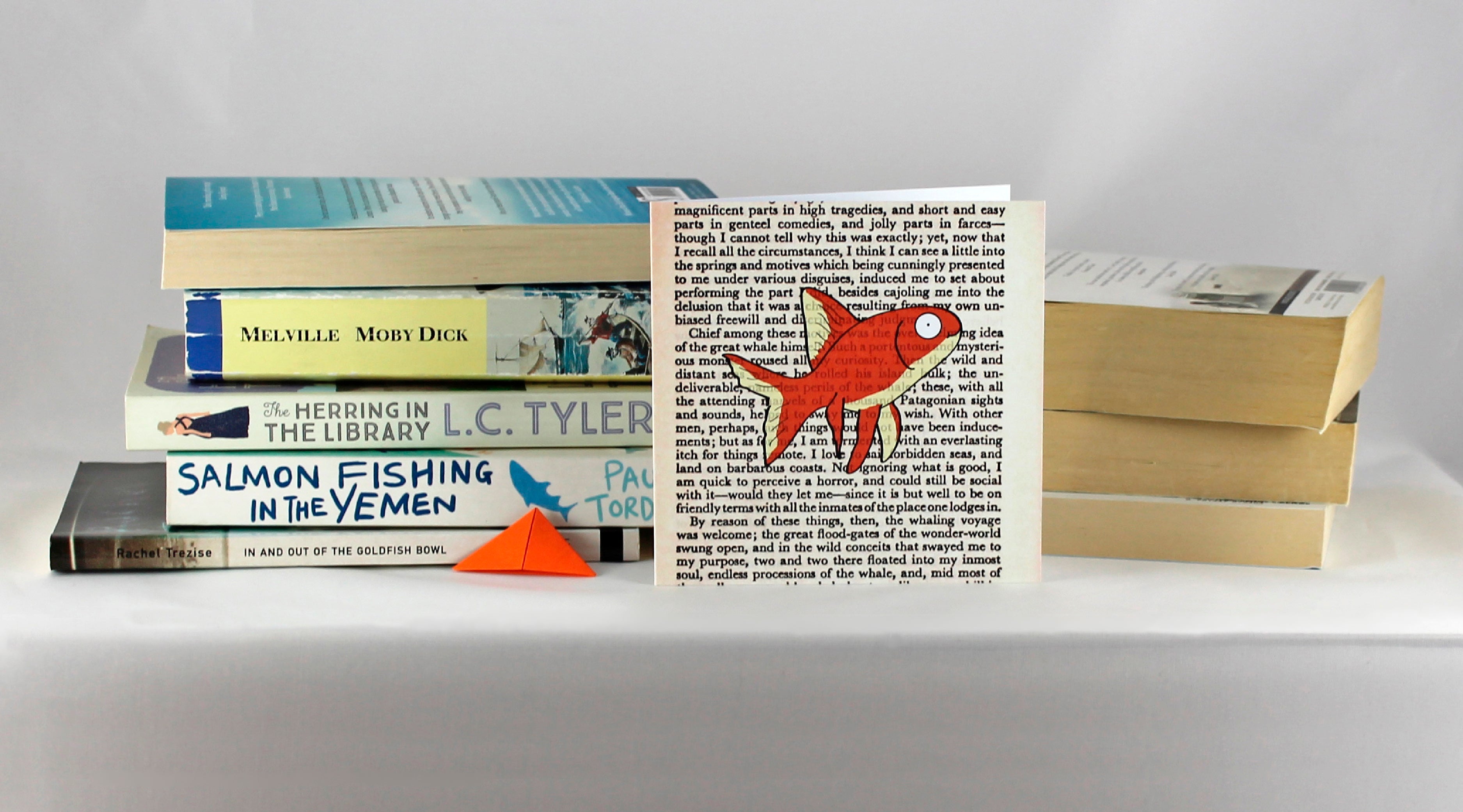 Eight little fishies set against a backdrop of a printed book page. Each card is completed with a handmade origami tail that transforms into a corner bookmark to use when you dive into your next book.